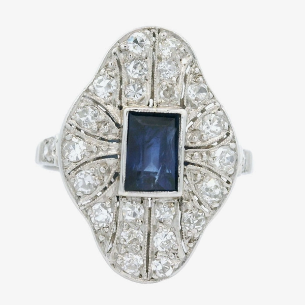 • Geometric brilliance: Platinum Art Deco Diamond and Sapphire Cluster Dress Ring — precise, low profile, clear contrast.