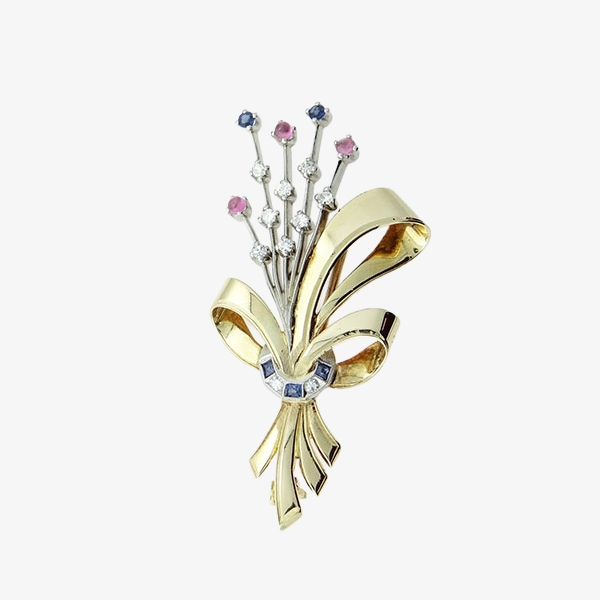 Retro covers later 1930s through the 1940s and into the 1950s. Expect sculpted ribbons, bows and bold polished forms, often in yellow or rose gold with bright stones.