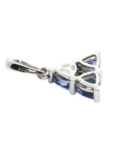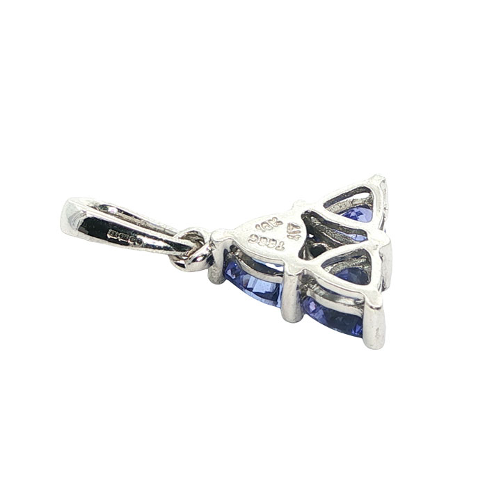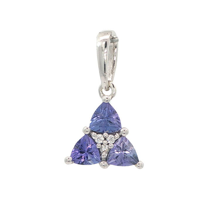 This elegant 10K white gold pendant showcases three trillion-cut tanzanite gemstones arranged in a graceful triangular cluster. The vibrant violet-blue hues of the tanzanites are beautifully complemented by three sparkling white zircons set at the centre, adding a delicate touch of brilliance.