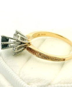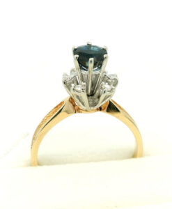 This distinctive 14ct gold ring features a beautiful high-set sapphire (approx. 0.50ct) elevated above a sparkling cluster of diamonds (approx. 0.12ct), creating a striking sense of depth and elegance. The concave yellow gold shoulders add vintage character and visual balance to the design.