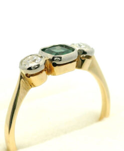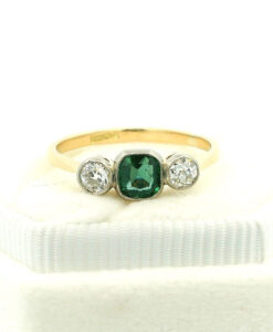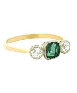 This stunning antique ring features a vivid square-cut emerald at its centre, flanked by two sparkling old cut diamonds. Each gemstone is set in an elegant milgrain (often called “migraine”) setting that enhances the vintage charm of the piece.
