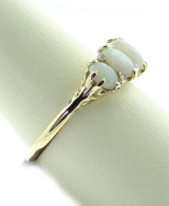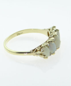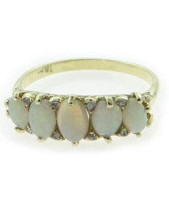 This lovely ring is set with five cabochon cut opals and eight old cut accent diamonds.