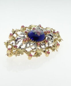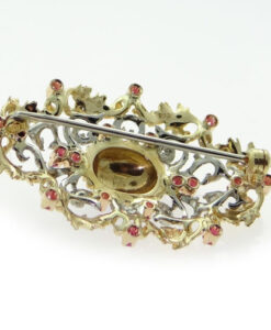 A beautiful 18ct white and yellow gold ornate ruby and enamel brooch.