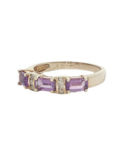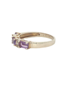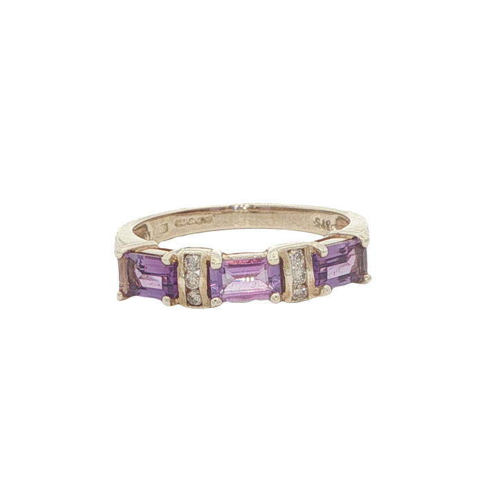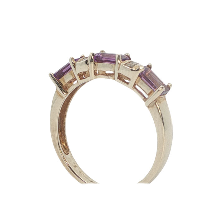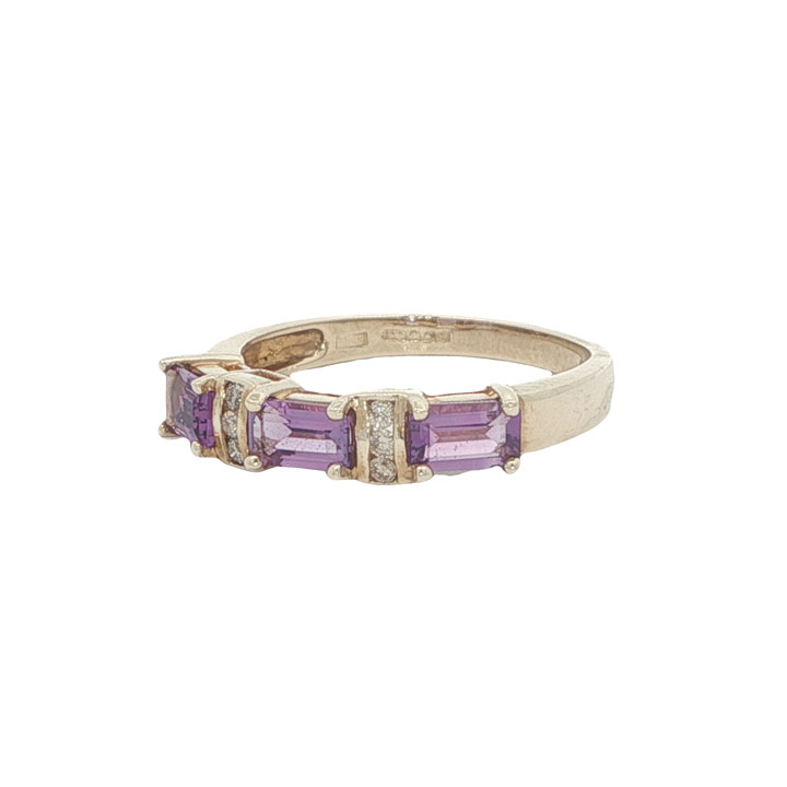 This elegant 9ct yellow gold ring is set with a row of vibrant step-cut amethyst gemstones, beautifully accented by delicate sparkling diamonds. The geometric arrangement adds a refined, contemporary feel, while the warm gold setting enhances the rich purple tones of the stones.