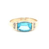A pretty 9ct yellow gold ring set with an oval blue topaz gemstone and accent diamonds.