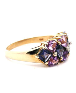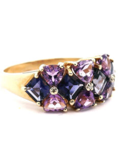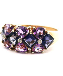 A solid 9ct yellow gold ring set with Amethyst and Iolite gemstones and accent diamonds for an extra sparkle.
