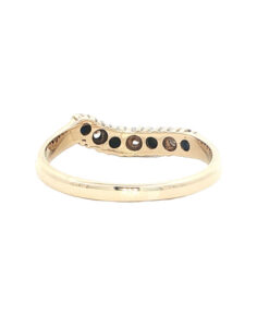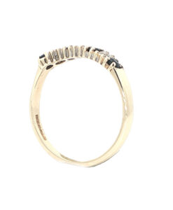 A classic 9ct yellow gold ring set with alternating deep blue sapphires and accent diamonds. The gemstones have been claw set in a curve design.