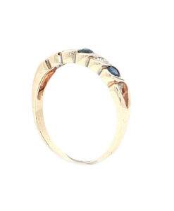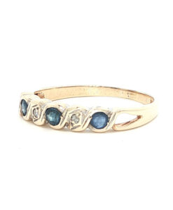 A timeless and elegant 9ct yellow gold ring set with alternating deep blue sapphires and accent diamonds. The gemstones are beautifully rim set in a twist design across the band, creating a refined and classic look.