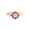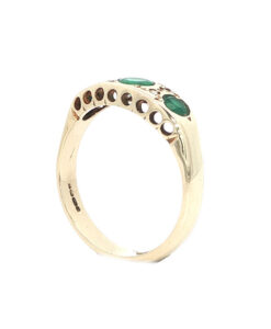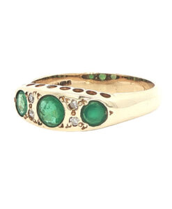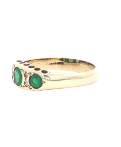 This beautiful 9ct yellow gold ring showcases a timeless design inspired by the elegance of the Victorian era. It features three vivid round emeralds, each separated by two sparkling accent diamonds, creating a graceful and balanced cluster arrangement.