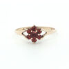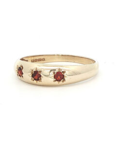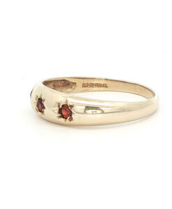 This gorgeous 9ct yellow gold band ring is set with three rich garnet gemstones, each beautifully star-set into the gold. The timeless star setting adds charm and character, making this a piece full of warmth and vintage style appeal.