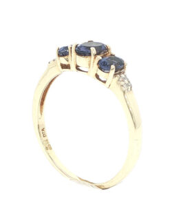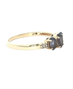 A very pretty 9ct yellow gold ring showcasing Diamond and Iolite gemstones. The purple tones of the three oval Iolite stones are beautifully enhanced by the warmth of the gold, while accent diamonds set at the top of each shoulder add a touch of sparkle and refinement.