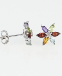 9ct White Gold rainbow gem and diamond flower cluster earrings.