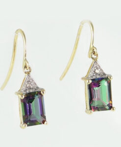 Each earring is set with an oblong cut mystic topaz gem stone and a sparkling accent diamond.