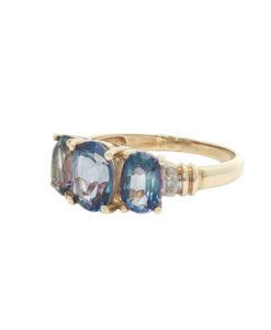 This fabulous 9ct yellow gold ring showcases three vivid oval-cut Neptune Topaz gemstones, each beautifully claw set in a tiered design that enhances their brilliance and depth of colour. The vibrant sea blue tones of the topaz are perfectly complemented by accent diamonds set into the top of the shoulders, creating a piece that is both elegant and eye-catching.