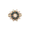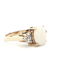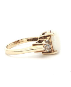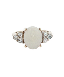 This pretty 9ct yellow gold cluster ring features an oval-cut opal at its centre, with cluster of sparkling white topaz gemstones on either side.