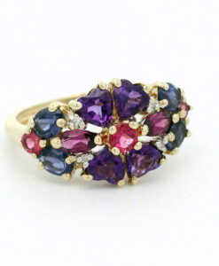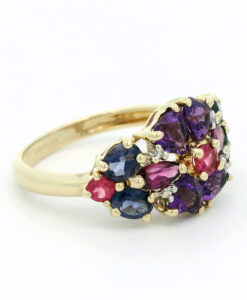 9ct Gold rainbow multi gem cluster ring set with amethyst, pink topaz, Iolite and alamandene garnet gem stones.
