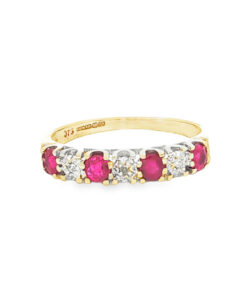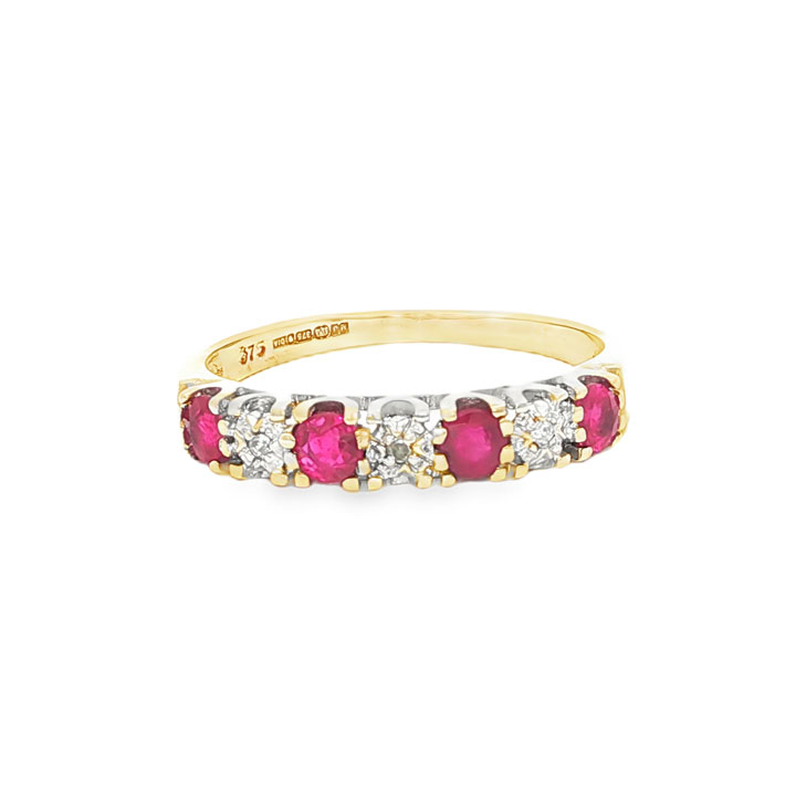 A pretty and elegant 9ct yellow gold band ring set with four round rubies and three sparkling accent diamonds. The diamonds are beautifully illusion set in white gold between each ruby, adding subtle contrast and extra sparkle.