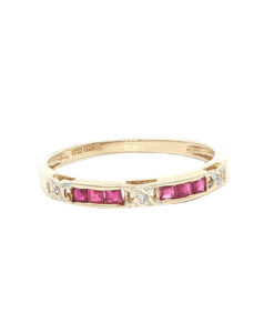 A charming 9ct yellow gold ruby and diamond band ring. Professionally polished and in excellent pre-owned condition.