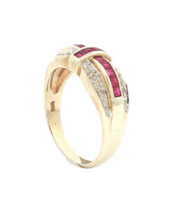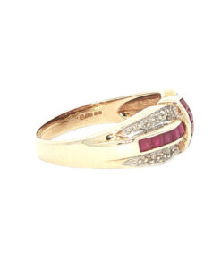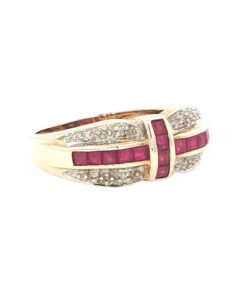 This fabulous 9ct yellow gold diamond and ruby cluster ring is full of charm and character. The vivid rubies are arranged in a striking cross formation, complemented by sparkling illusion-set diamonds in white gold. The bold yet elegant design is wonderfully eye-catching — even reminiscent of the England flag.