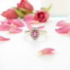 This pretty 9ct yellow gold ring features a vibrant oval-cut ruby at its centre, flanked by two sparkling diamonds set in charming star motifs. The elegant cross-over design of the shoulders gives the ring a soft, flowing silhouette that’s both classic and graceful.