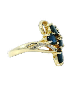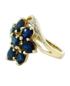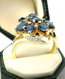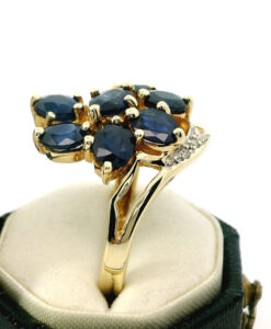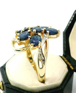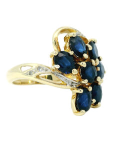 This beautiful 9ct gold ring showcases seven deep blue oval sapphires, with a total sapphire weight of approximately 2.00ct. Each sapphire is securely held in claw settings, allowing the rich blue tones to shine. The design is further enhanced by sparkling diamond accents set into the gracefully swirling shoulders, adding extra brilliance and sophistication.