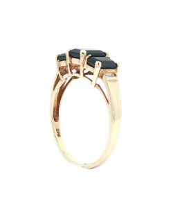 This striking 9ct yellow gold ring features three emerald cut sapphires claw set with an accent diamond at the top of each shoulder. The deep blue tones of the sapphires contrast perfectly against the warm glow of yellow gold.