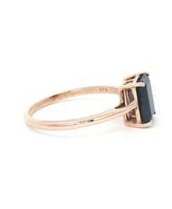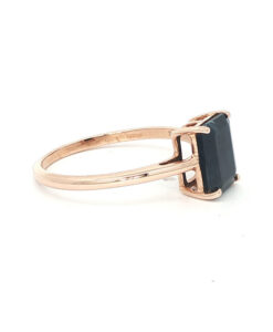 A striking sapphire solitaire ring, beautifully crafted in 9ct rose gold. The deep blue emerald cut sapphire is securely claw set in a classic four claw setting. Creating a timeless and elegant ring.