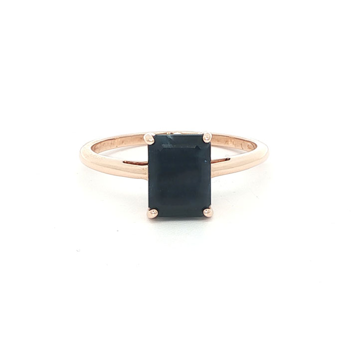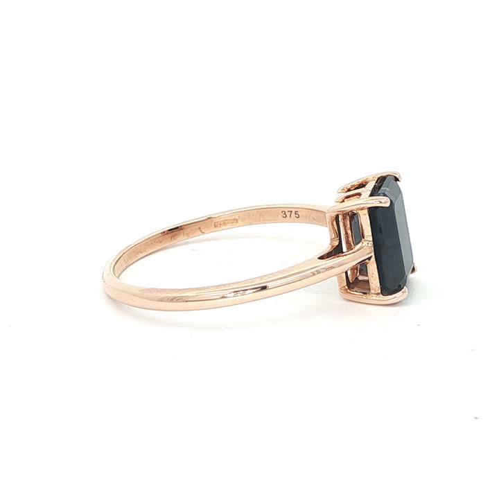 A striking sapphire solitaire ring, beautifully crafted in 9ct rose gold. The deep blue emerald cut sapphire is securely claw set in a classic four claw setting. Creating a timeless and elegant ring.