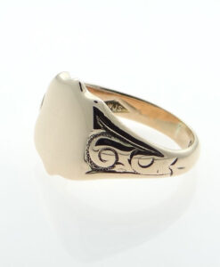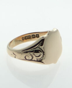 9ct rose gold shield signet ring with beautiful embossed shoulders.