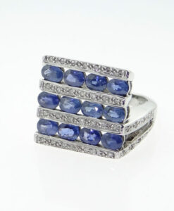 Three rows of oval cut sapphires and four rows of brilliant cut diamonds.