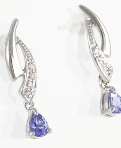 9ct white gold tanzanite and diamond earrings. Each earring is set with a pear cut tanzanite gemstone and sparkling accent diamonds.