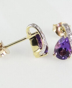 9ct yellow gold amethyst and diamond earrings set with a pear cut amethyst gem stone and sparkling diamonds. The diamonds are set in 9ct white gold. 9ct yellow gold butterfly fasteners.