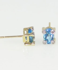 Each earring is set with an oval cut blue topaz gemstone and four sparkling accents diamonds.