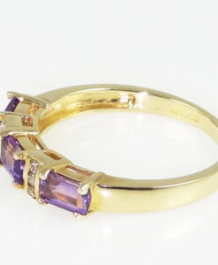 This lovely ring is set with three amethyst gem stones and diamonds.
