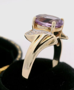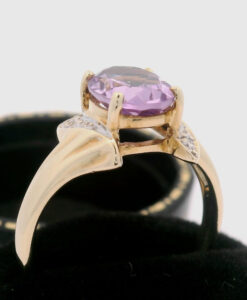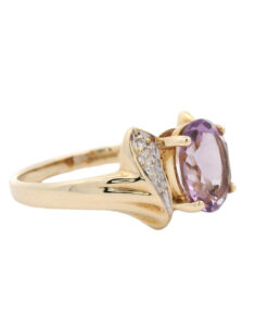 This stunning 9ct gold diamond and amethyst ring, features a claw set oval cut amethyst, accentuated by sparkling accent diamonds set into the top of the shoulders.