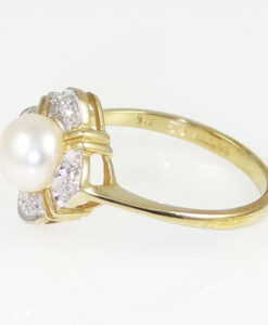 9ct Yellow Gold Diamond and Pearl Ring. This lovely ring is set with a pearl and diamonds. The ring has 9ct yellow gold shoulders and shank.