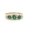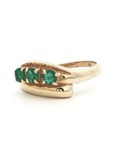 This elegant 9ct yellow gold ring features three vibrant, round emeralds, each expertly claw-set to create a striking and timeless design. The shoulders of the ring gracefully swirl around the gemstones, adding a unique touch of sophistication.