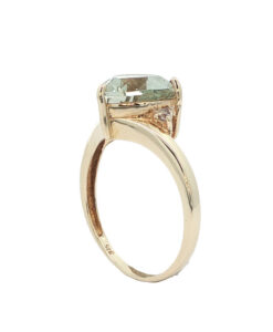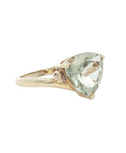 This striking ring is crafted in 9ct yellow gold and showcases a dazzling trillion-cut green amethyst. The soft green hue of the gemstone sparkles beautifully with every movement, while the elegant wishbone-shaped design of the band adds a contemporary and stylish twist.