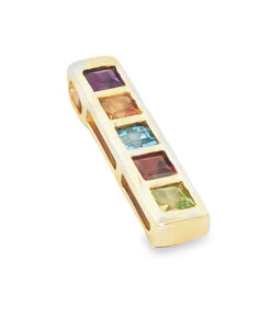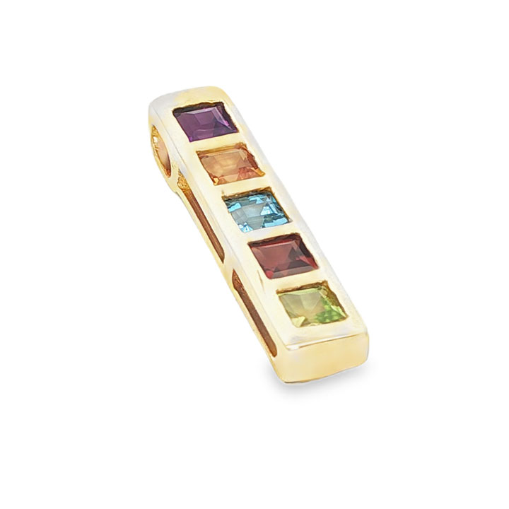 This beautiful 9ct yellow gold pendant features a striking vertical bar design set with five vibrant gemstones — garnet, peridot, amethyst, blue topaz, and citrine. Each square-cut stone is securely bezel-set in a smooth gold frame, creating a colourful and contemporary look that catches the light from every angle.