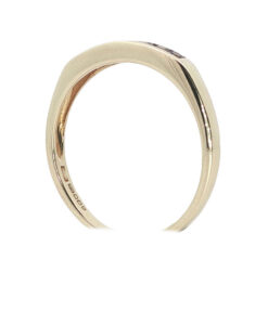 This lovely 9ct yellow gold ring showcases the enchanting beauty of tanzanite. The tanzanite gemstones have been channel set. This is 2mm wise, so it would be a perfect stacking ring or worn alone.