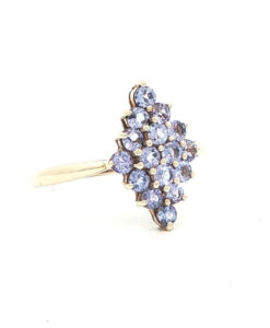 This beautiful 9ct yellow gold cluster ring radiates timeless elegance. The design features round-cut tanzanite gemstones, each securely claw set to form a striking diamond-shaped cluster. The vivid violet hues of the tanzanite shimmer with sophistication, making this ring a captivating choice for any tanzanite gemstone lover.