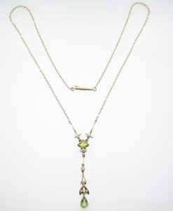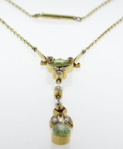 This beautiful 15ct gold pendant is set with old cut diamonds and peridot gemstones.