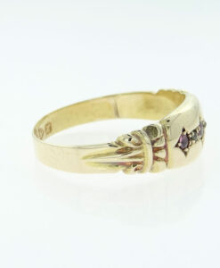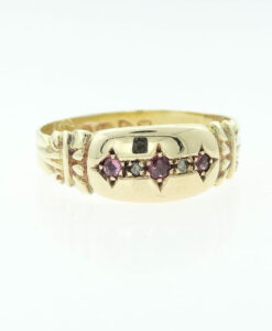 This very pretty antique Gypsy style 18ct gold ring is set with three old mine cut rubies and two diamonds.
