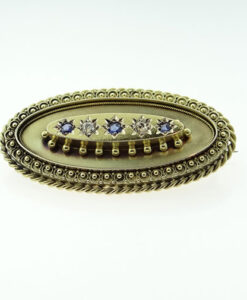 This Antique brooch is oval shaped and has three sapphires and two diamonds which are claw set.
