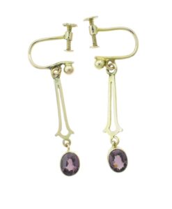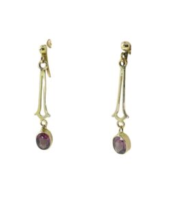 A very pretty pair of 9ct rose gold garnet drop earrings from the Edwardian era. These earrings are set with deep pink almandine garnets, that have been bezel or rub over set with the finest of millgrain beading to the inside edge of the setting. They have screw-back fasteners.