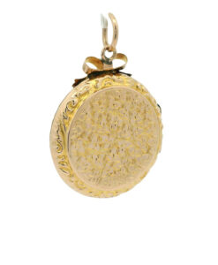 A beautiful antique round locket crafted in pale rose gold (back and front), dating to around 1900. This charming piece features an elegant bow surmount and is delicately engraved on both sides.