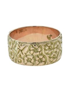 A solid gold band ring crafted in warm 9ct rose gold. It is beautifully embossed with hearts, flowers and leaves.