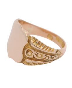 A lovely antique shield signet ring in warm 9ct Rose Gold. The scrolled shoulders add a touch of antique charm.