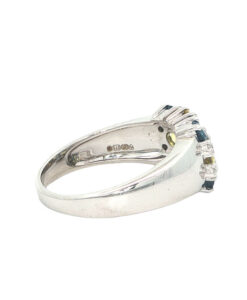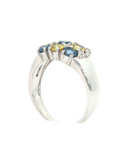 Add a pop of colour with this stunning 9ct white gold ring set with blue and yellow sapphires and sparkling diamonds.