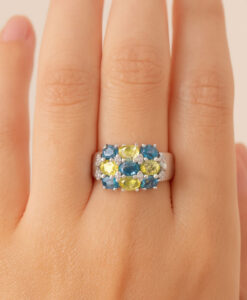 A striking and colourful 9ct white gold ring set with a dazzling combination of blue and yellow sapphires, accented by sparkling diamonds. Each gemstone is securely claw set, creating a stunning checkerboard style cluster that catches the light beautifully.